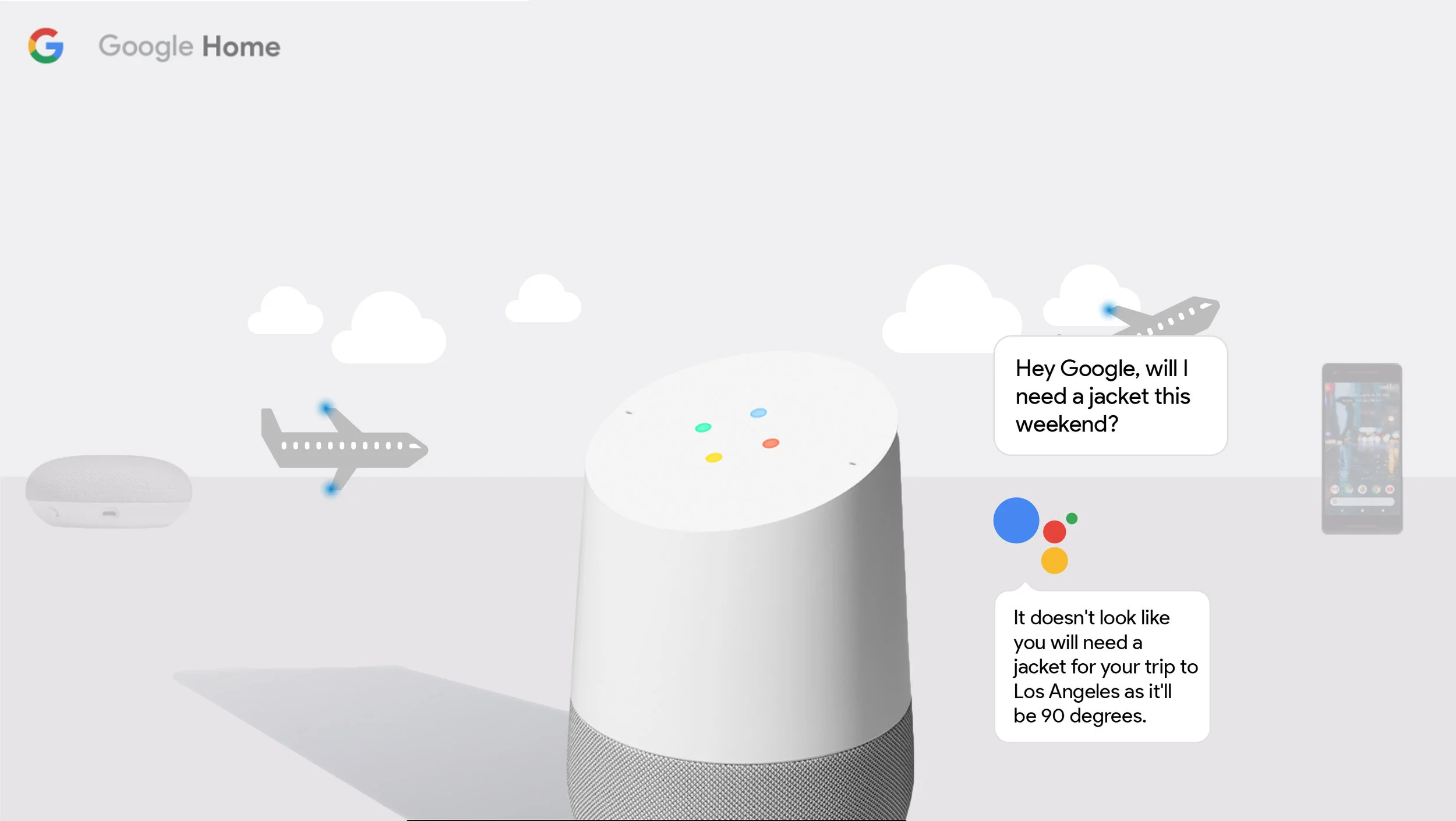 One of the three products (in this case, Google Home) is showcased on the idle state. An animated CTA is visible on the bottom of the screen, inviting the user to begin interacting with the experience.