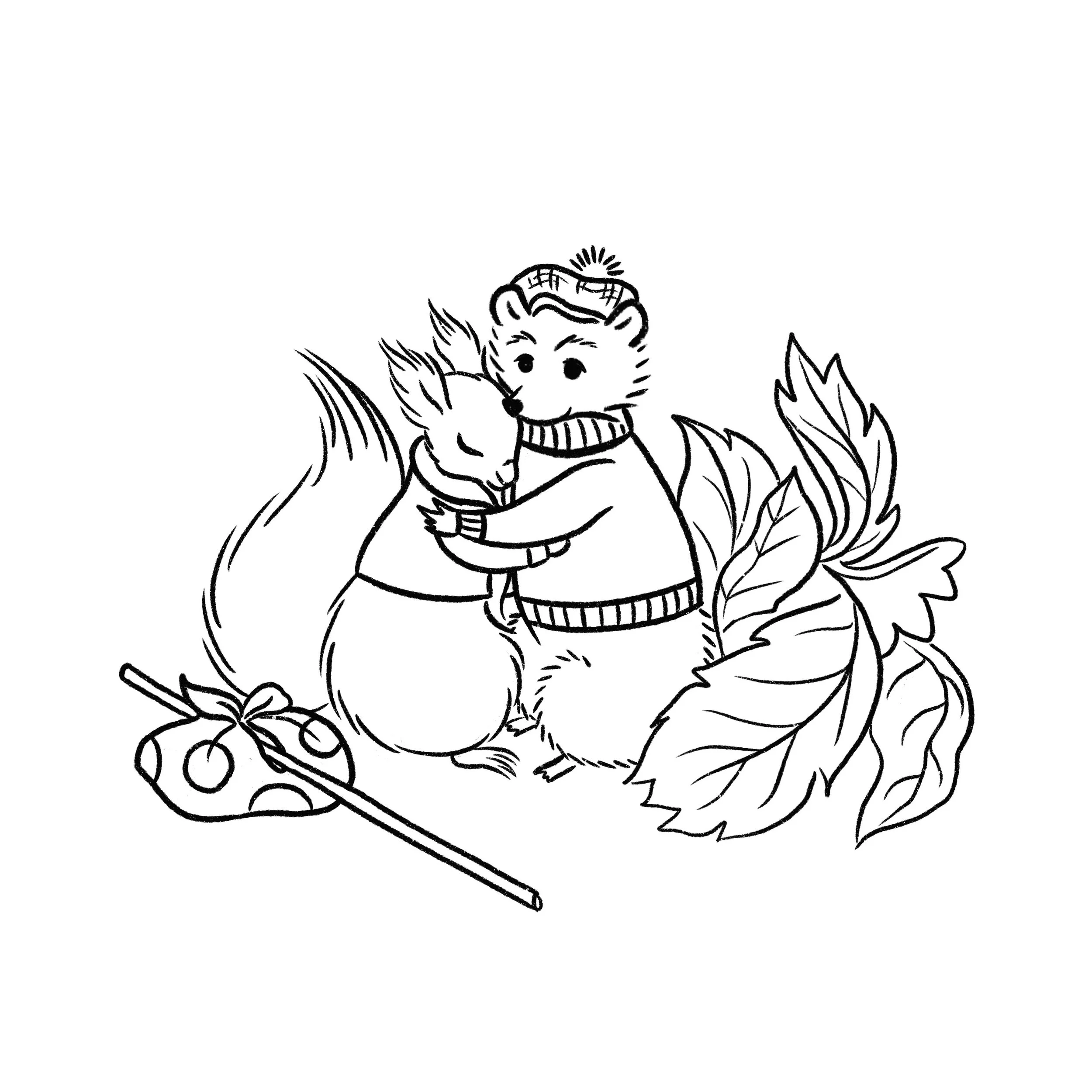 Squirrel was almost home, but her sack was still heavy, and now she worried who else might not have enough to get through the Storm. Suddenly she heard a great yawn, and saw Hedgehog stretching as he came out of his Nest, for unlike Squirrel, he slept all Day and was awake all Night. “Hello friend Squirrel!” He called. “What news from today?”